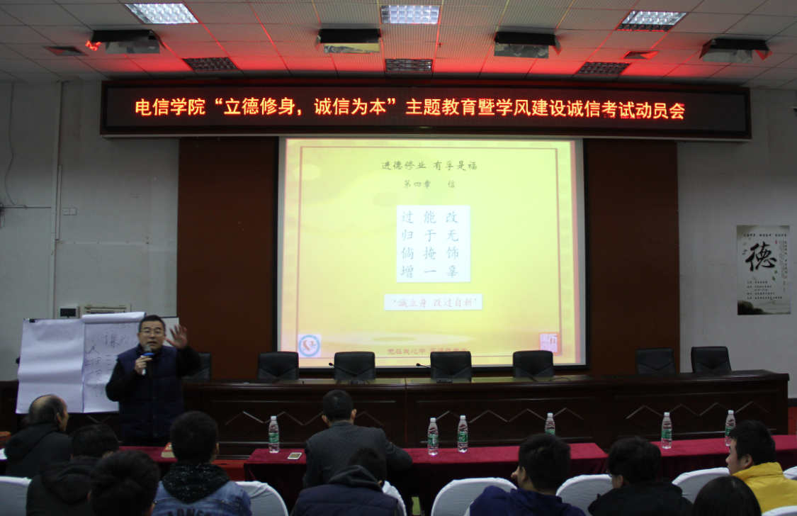 为进一步加强学风建设,引导学生诚信考试,促进学生养成良好的诚信道德品质,电信学院于2017年12月22日下午在致远楼学术报告厅举办 “立德修身,诚信为本”主题教育暨学风建设诚信考试动员会。校关工委副主任李云龙教授,邓名皋教授,电信学院辅导员江艳出席了动员会;近300名电信学子参加了动员会。会议由电信学院党总支副书记胡小毅主持。