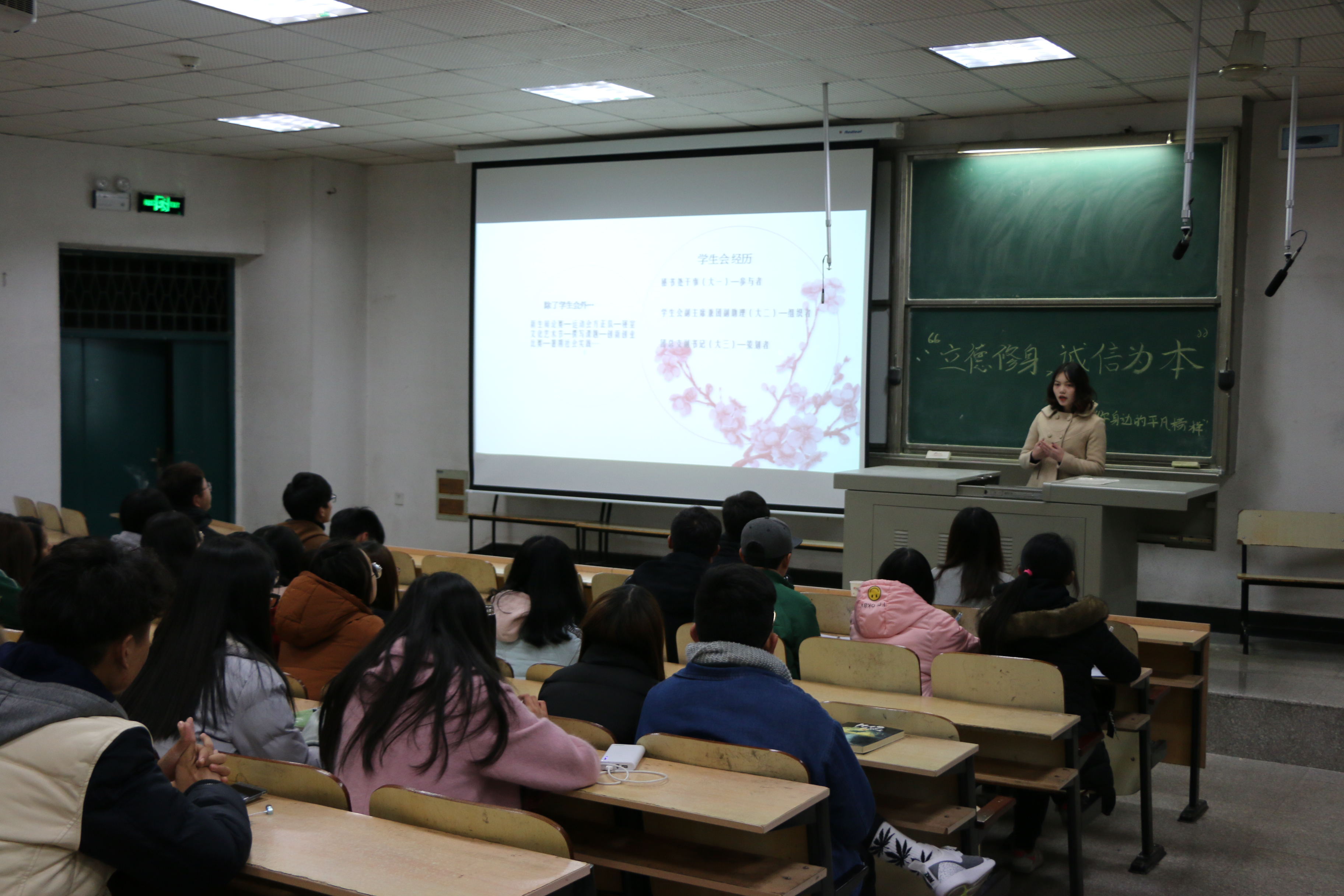 12月19日晚7点,经管院“立德修身,诚信为本”——你身边平凡的榜样主题讲座在A多1教室召开,我院特邀经管院团总支副书记熊蔓莲,第三届学生会青志协部长龚曼丽,2017年“经管之星”刘美容同学主讲。院党总支副书记王永启,辅导员黄敬茹老师出席讲座,院学生会全体干事参加了讲座,本次讲座由学生会主席胡素主持。
