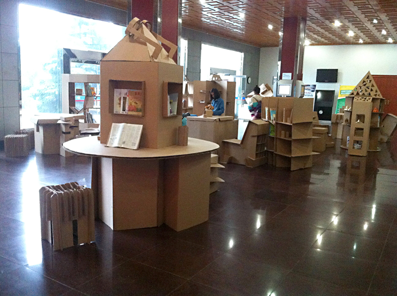 本次活动是由艺术设计系朱希平老师带领13级环艺一、二班的同学们以“绿色环保,可持续设计”为宗旨,利用废旧纸板材料设计制作成书架,书桌,椅子等作品供全校师生体验;同时发动广大师生把自己已经看过的、有意义的闲置书籍拿出来,待活动结束时凭还书卡自由换取自己喜欢的别人的书,实现资源共享,知识增值。