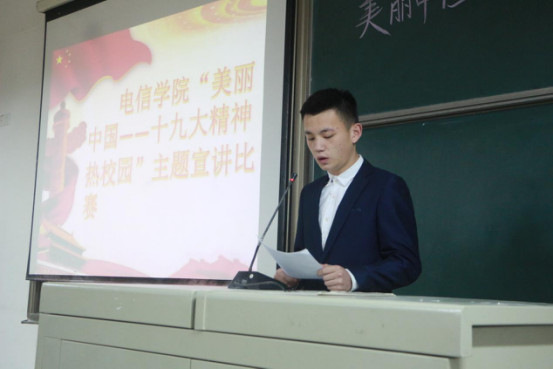 4月16日晚,电信学院组织开展的“美丽中国——十九大精神热校园主题宣讲”活动精彩开讲。学院党总支副书记胡小毅、学工办主任江艳以及辅导员杨然钧担任评委。