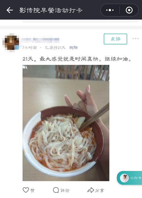 活动从5月4日持续至5月25日,共计21日。活动要求所有参赛者每天在规定时间段分享自己的早餐照片,并配合做出当天规定的相应手势,方完成一天打卡,坚持21天者将会获得相应奖品。由于活动形式新颖,操作简单,作用积极,吸引了来自影传、法学、经管、机电、计数、土木等学院200余名同学参与。其中更是有一个寝室,12名同学全部报名参与了活动。他们表示,就是想通过活动监督全寝室早睡早起,健康生活,一起努力学习。最终,共计80名同学成功坚持21天,完成活动目标。