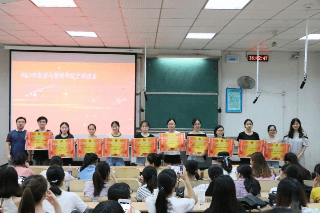 6月19日下午,经济与管理学院在涵虚楼B多1教室举行了“文明寝室”颁奖典礼。我院党总支副书记王永启,辅导员黄敬茹老师莅临颁奖现场。颁奖典礼由权益部部长高市明主持。经管院所有获奖宿舍代表参加了此次活动。