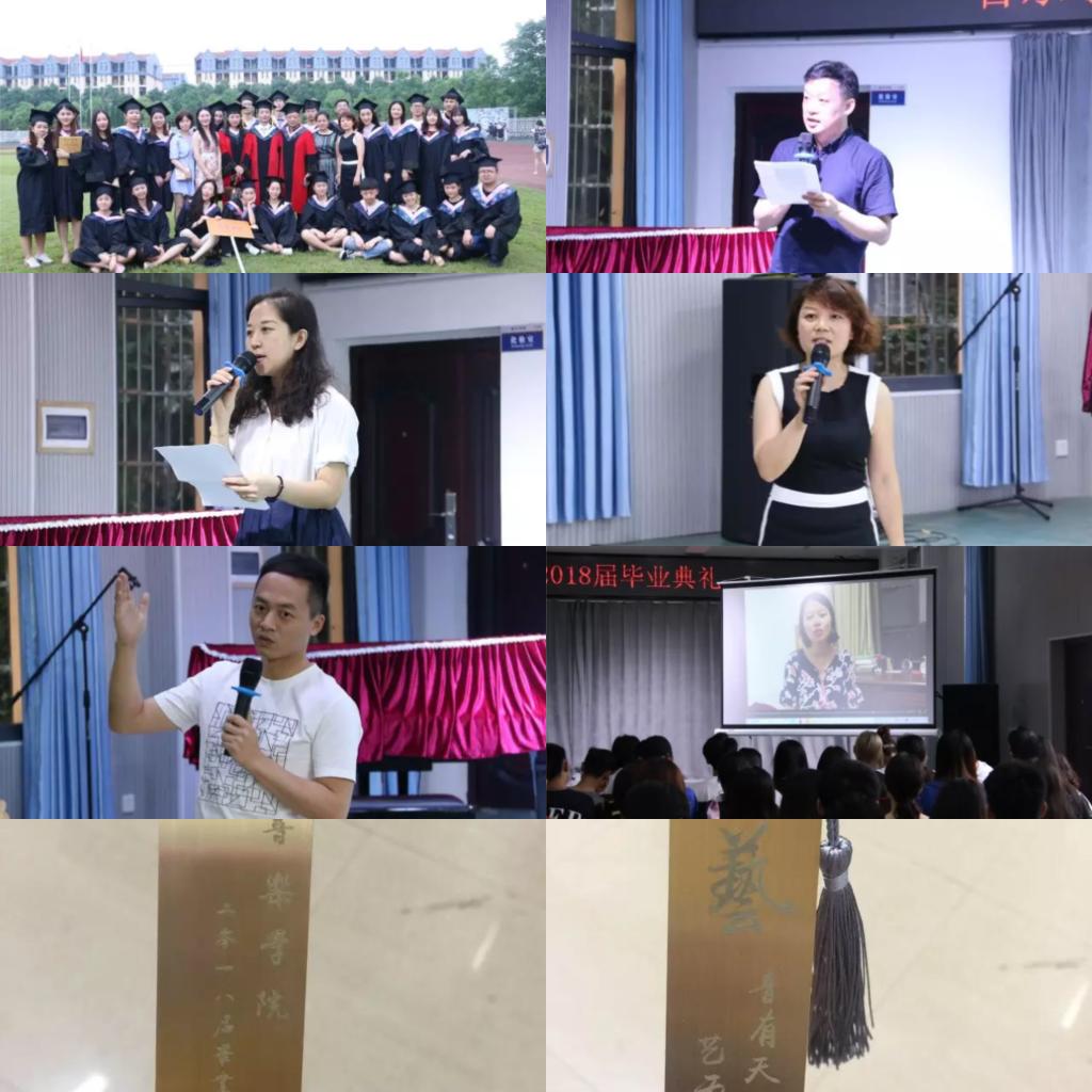 6月21日,在学校2018届毕业典礼后,音乐学院2018届毕业典礼在音乐楼小报告厅如期举行,参加人员有院长刘淮保、党总支书记陈滨滨、党总支副书记符勤、副院长谢萍、器乐教研主任熊琦、实践教研主任贺辉、声乐教研主任余佳、公共艺术教研主任王琛媛、2014级班主任代表张晶、黄卓以及2018届全体毕业生。本次毕业典礼由党总支副书记符勤主持。