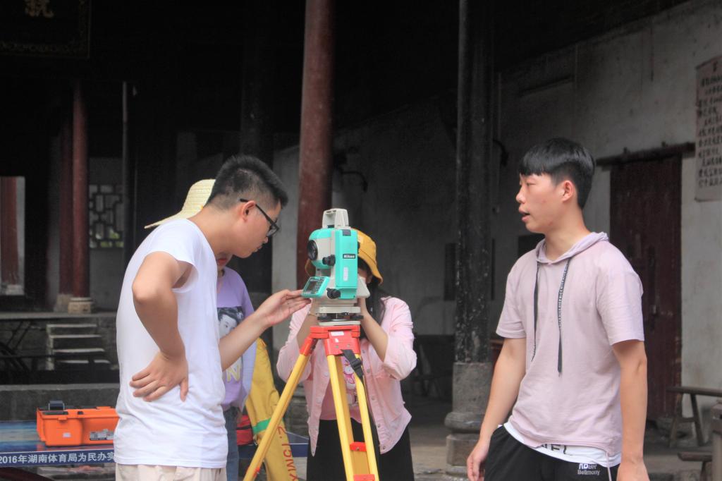宁远县文物局文物股何股长全程陪同并且在现场向大家介绍了古建近年来的破损和修复情况,同时邀请到了大界源村的村民委员会主任向大家介绍了古建的历史人文背景以及在村落文化中所起的重要作用,随后,测量组成员便在胡世平老师的指导下架起了全站仪,开始了紧张有序的测量工作。烈日炎炎,骄阳似火,测量组同学冒着高温,顶着烈日,精准无误的测量和记录数据。