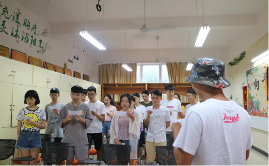 素质拓展活动围绕团队协作游戏、经验分享、“宣誓吧,新生引路人”三个环节展开。团队协作游戏包括异性圈、人椅2018、模拟班会、齐眉棍、头脑风暴、气球链接加速运动。异性圈游戏气氛尤其活跃。在音乐背景下,团队领导者带领大家里外站两个圆圈;随着领导者口号,两个圈圈向相反方向走动;音乐停后,相对的两人直视对方眼睛微笑,自我介绍后握手说:我叫某某某,认识你真好,很高兴认识你。游戏有效地缓解了成员们之间的尴尬。随后的“齐眉棍游戏”将活动现场气氛推向高潮。游戏中,成员们努力尝试,发挥团队合作精神,克服困难,完成一轮又一轮的挑战。