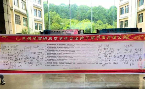 最后,学生会副主席熊少琴领读团总支、学生会自律公约;全体干部、干事在自律公约倡议书上签字。