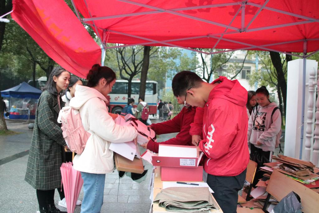 在初冬的寒风细雨中,志愿者们每天在维智广场进行摆点工作。活动开始不久便有积极的同学排着队伍送出手中的纸盒,志愿者们接过纸盒悉心地摊平叠放在一起。为方便同学,热情的志愿者还提供免费拆快递盒服务。同时,为送出纸盒的同学递上一件小礼物。活动期间,每天晚上各学院的志愿者们都会下寝回收快递盒子。土木工程学院志愿者刘惠洁说:“虽然活动当天天气很冷,但在看到同学们都积极地来参加活动时,内心却是十分温暖的,我们长大学子都有一颗环保的心,这个冬天不寒冷。”