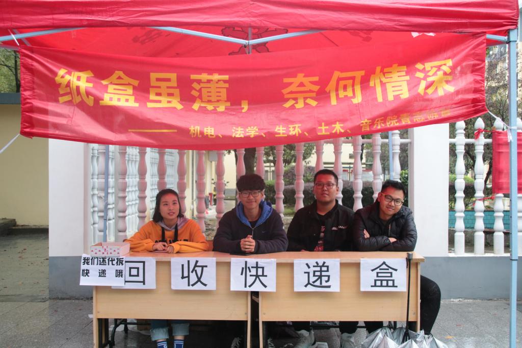 “双十一”后的快递包装纸、包装盒如何处置?11月14日至11月18日,长沙学院土木工程学院、机电工程学院、法学院、生物与环境工程学院、音乐学院在长沙学院维智广场联合举办了“纸盒虽薄,奈何情深”活动。参与对象为长沙学院全校学生。