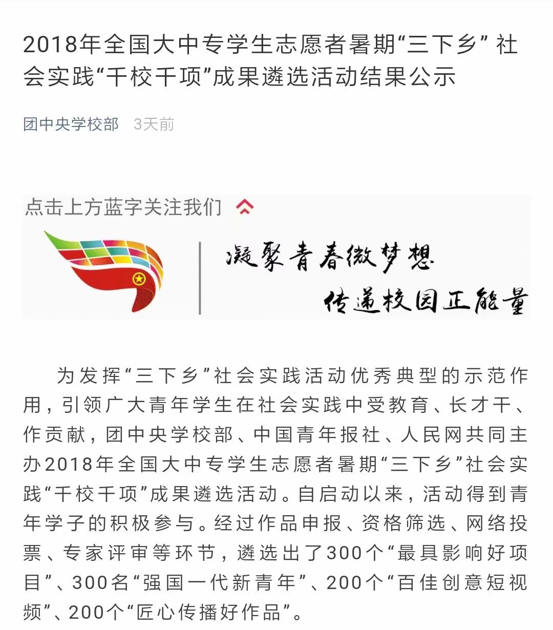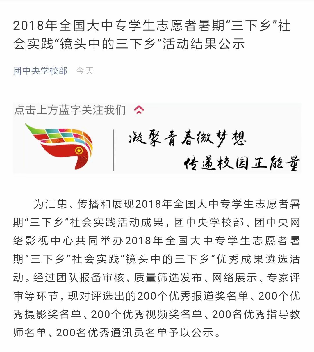 近日,由团中央学校部等单位主办的2018年全国大中专学生“三下乡”暑期社会实践评选结果正式公布,我院“护中华古建,守民族根魂”暑期社会实践团作品有两个作品喜获“千校千项”成果遴选活动百佳创意短视频奖(全国共200项)、“镜头中的三下乡”优秀成果遴选活动优秀报道奖(全国共200项),加上已公布的暑期“三下乡”社会实践优秀团队奖(全国共400项),截止日前,我院暑期社会实践团已斩获团中央三大奖项,获奖数量位居全校前列。