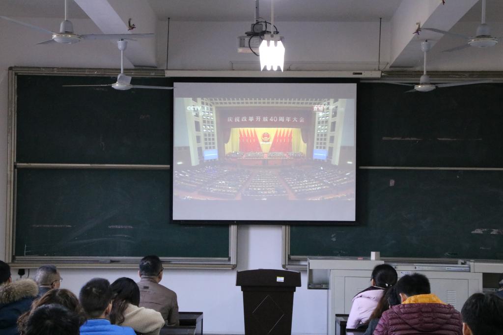 2018年12月18日上午10:00,土木工程学院在理工楼A303组织师生观看庆祝改革开放40周年大会的电视直播。学院党总支书记张跃佳、院长谢立辉、副书记盛旺、副院长肖婧以及全体师生党员现场观看了此次会议的电视直播。