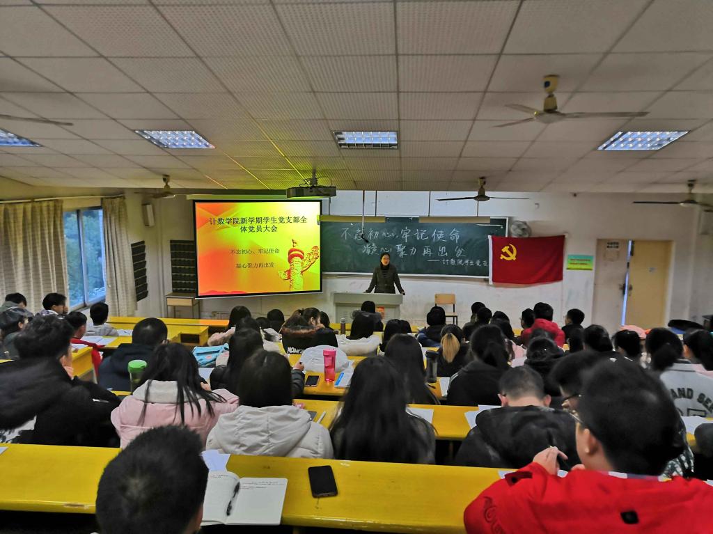 2019年3月5日下午17:30,计算机工程与应用数学学院学生党支部以“不忘初心、牢记使命,凝心聚力再出发”为主题,在致远楼2401举行了新学期第一次全体学生党员大会,党总支副书记王芳、各学生党支部书记出席,学生党员参加会议。