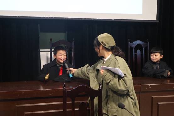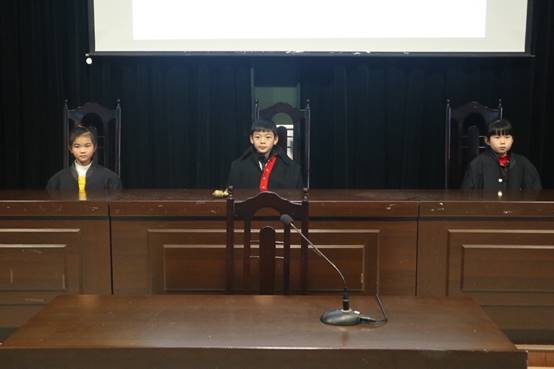 “现在开庭!”本次活动以模拟法庭、情景剧演绎、穿上法官法袍互动学习等形式相继开展。模拟法庭就“校园暴力借钱”这一案例进行审理,通过法庭调查、法庭质证再到法庭辩论等环节的开展,让40名小朋友真正融入到了法庭庄严肃穆的氛围中。展示完成后,小朋友们就法庭的程序、审判结果及法庭人员构成等问题踊跃地向主持人发问,激发了小朋友们对法律的兴趣。“穿上这个衣服,坐上这个椅子,让我感觉自己变了个人”小朋友们穿上法袍、坐上审判庭,让在场的小朋友们零距离感受到了法庭的肃穆。