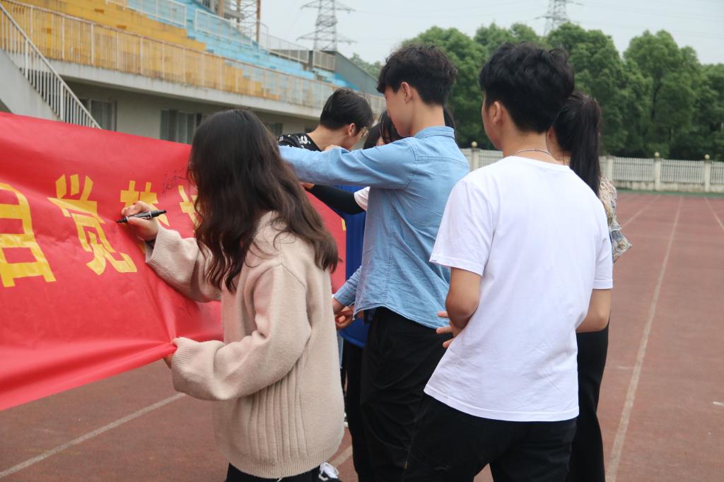 随后,学院组织全体新团员入团宣誓,老团员重温入团誓词。在优秀团员代表张译文同学的带领下,全体团员面对国旗和团旗,右臂高举,庄严宣誓。声音环绕操场上空,催人奋进,给人力量。最后,大家有序地进行了“自觉禁控烟酒 引领健康生活 ”签名活动。