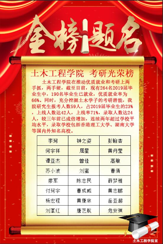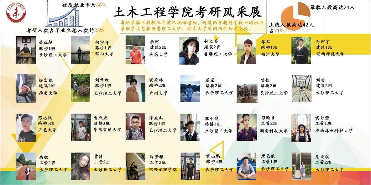 一直以来,土木工程学院注重在推动优质就业和考研上两手抓,两手硬。学院以“就业就是最大的民生”为指导思想,着力形成“全员、全过程、全方位”指导服务就业工作格局。学院领导高度重视,学校社会多方参与,打造相对稳定、逐步提升、适应不同层次学生的立体化就业网络,凝聚全员就业力量;从大一到大四,从前一年暑假到后一年暑假,奠定全过程就业基础;将就业和专业学习以及综合素质的提升相结合,打开全方位就业局面。截止目前为止,我院2019届毕业生264人,其中150名同学签约国企,24名学生考取研究生,优质就业率高达66%,居全校前列。