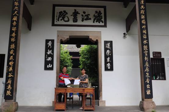 2019年6月16日,外国语学院党总支书记王应德带领该院“Travelpal项目团队”成员赴醴陵市渌江书院,参加在这里举行的“Travelpal景区多语种语音讲解助手项目”合作意向签约暨“长沙学院外国语学院实践教学基地”授牌仪式。醴陵市文旅广体局党委副书记兼渌江书院管理所所长袁婉玲、渌江书院管理所办公室主任张张子睿参加仪式,仪式由渌江书院管理所副所长邓安琪主持。王应德、袁婉玲分别代表我校外国语学院、醴陵市渌江书院管理所授牌和接牌,并分别在项目合作意向书上签字。
