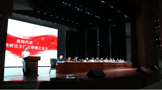 王春博士代表土木工程学院全体教师发言,他以自己的学习经历,用朴实的话语告诉新生要思考大学应该如何做以及拼搏奋斗的意义所在,希望在场新生利用好大学时间,让自己大学四年能够华丽的转变。