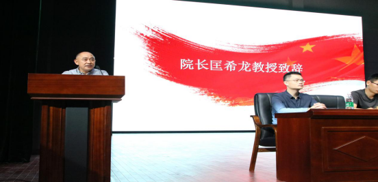 院长匡希龙致辞,他向新生介绍了学院的办学特色以及人才培养的目标,希望全体新同学严格要求自己,在未来四年中学有所成,充分展现土木精神,做优秀土木人,为新时代贡献自己的力量。