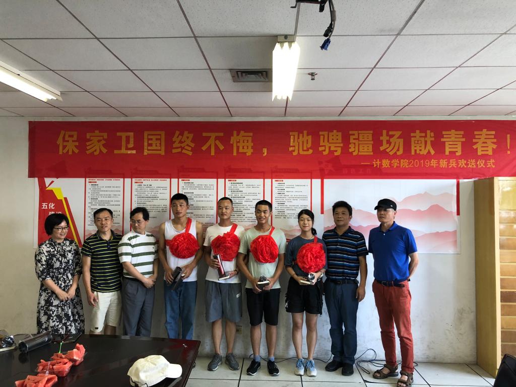 9月10日上午11时,长沙学院计算机工程与应用数学学院在致远楼1612会议室举行2019年新兵入伍欢送仪式,计数学院院长李方敏、党总支书记曾一兵,副院长何文德、副院长赵碧海,党总支副书记廖良梅以及学工辅导员出席,为即将踏上征途、走进军营的6名大学生新兵送行,勉励他们建功立业、报效祖国。