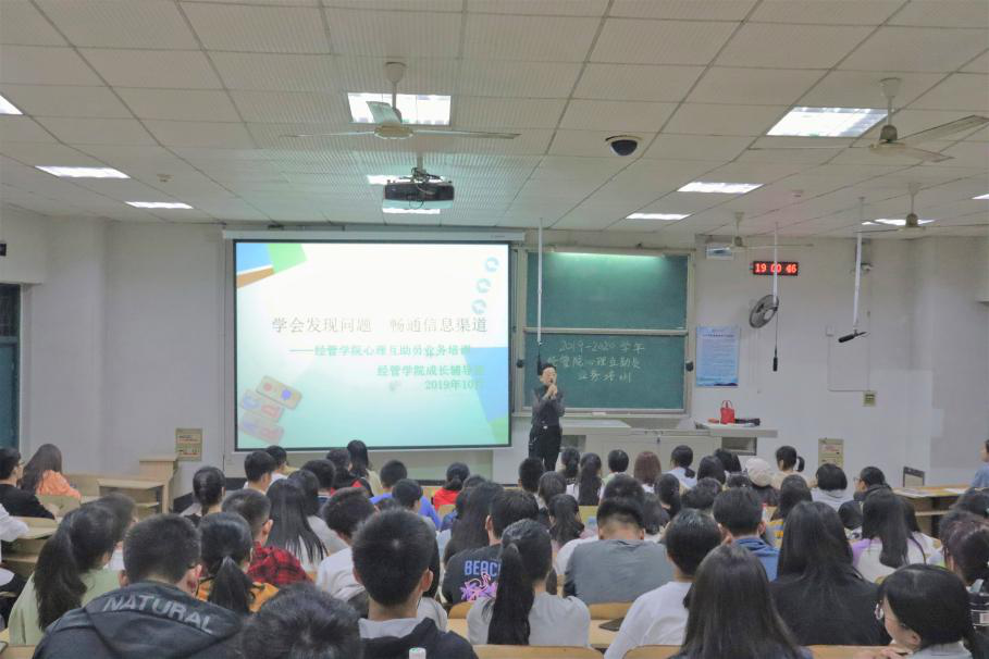为充分发挥朋辈心理互助员在大学生学习、生活中的重要作用,使他们能以更加专业、更加良好的状态迎接下来的心理工作,2019年10月10日晚7点,经管学院成长辅导室于涵虚楼C多3教室开展了2019-2020学年朋辈心理互助员业务培训。参加培训的有2016-2019级心理委员、寝室长参加。培训主讲人为学院心理联络员,国家二级心理咨询师周欣老师。