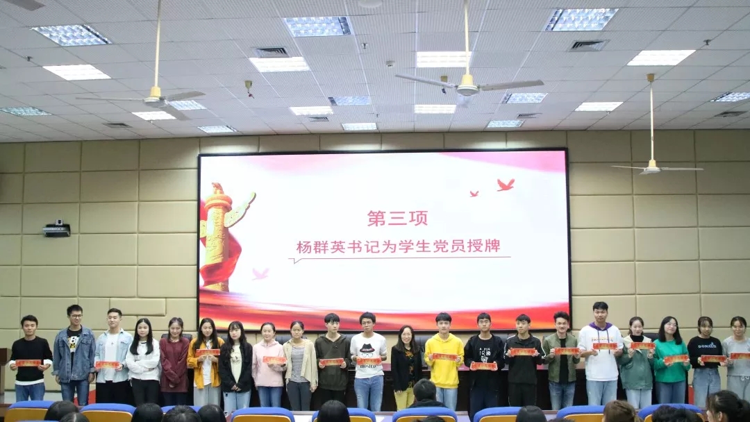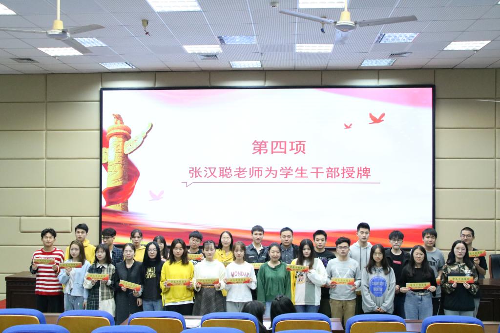 最后,杨群英副书记和张汉聪老师分别为学生党员和学生会干部授牌。杨书记则鼓励在场的党员和学生干部:要亮身份、做实事,认真履行义务,发挥先锋模范作用,全心全意为同学们服务,为学院的建设发展增光添彩。