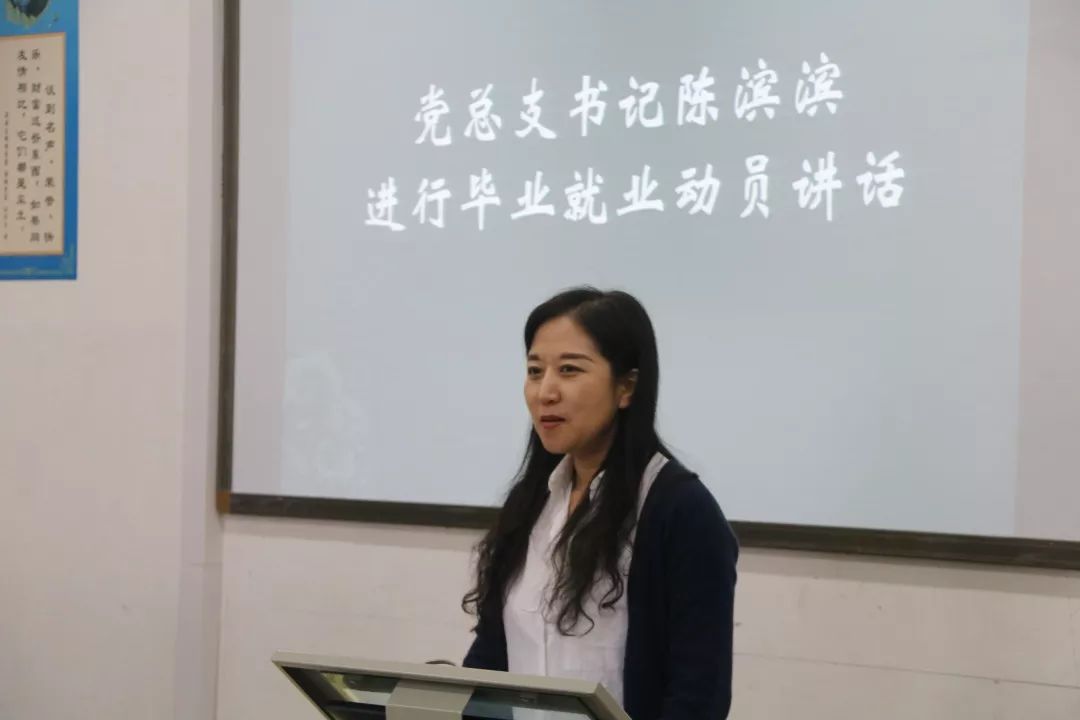 首先,党总支书记陈滨滨就当前毕业生就业形势和就业方向提出要求:要抓住机遇,鼓励同学们以积极心态面对就业;要志存高远,不仅要有坚实的个人基础也要拥有集体意识;要不断进步,在工作实践中锻炼自己的能力,在进步中不断成长。