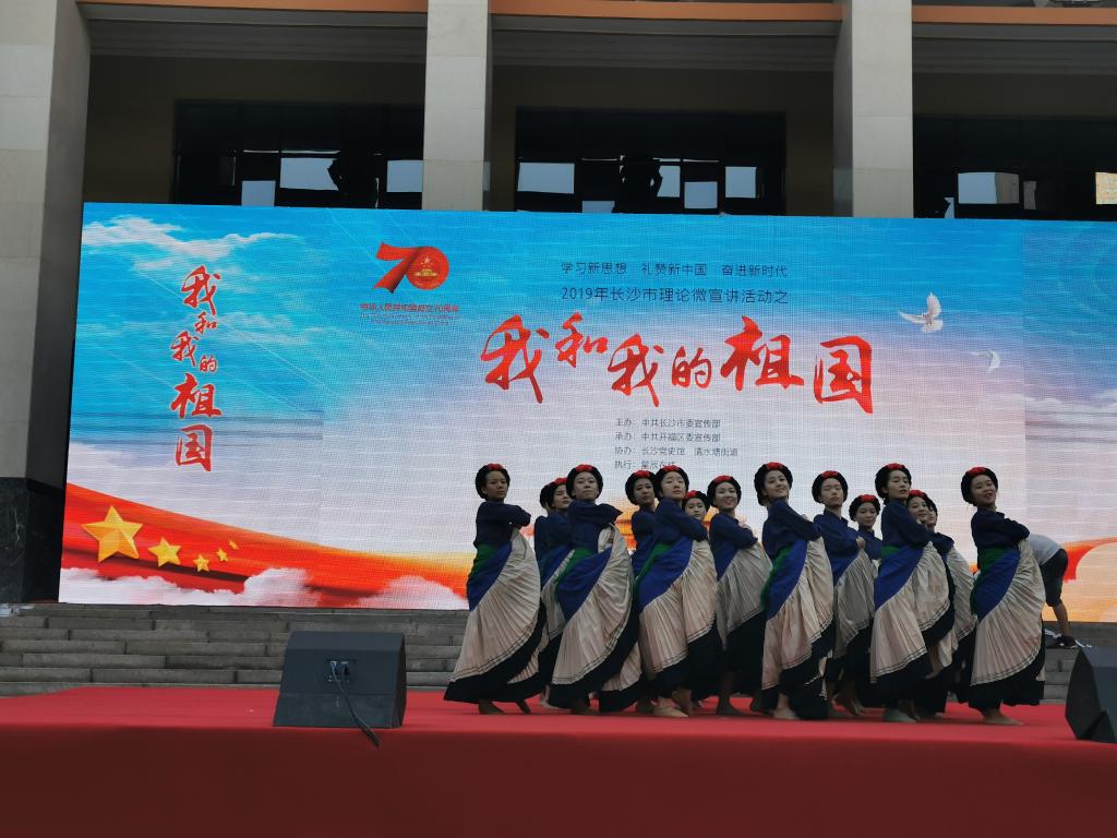 为进一步激发广大群众的爱国情怀与自强不息、奋发向上的自豪感,长沙市委宣传部主办、开福区委宣传部承办的“学习新思想 礼赞新中国 奋进新时代”2019年长沙市理论微宣讲活动之“我和我的祖国”专题赛活动于9月29日上午在中共湘区委员会旧址(长沙党史馆前坪)进行,音乐学院2018级舞蹈学1班受邀表演彝族群舞《情深谊长》。