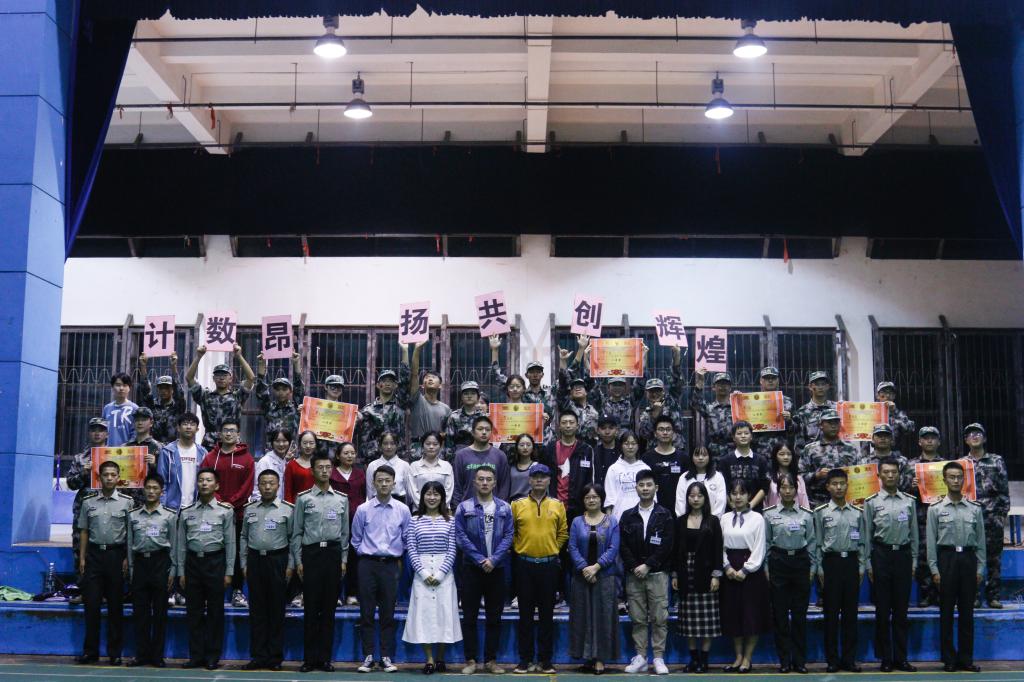 夜幕之中,永康体育馆外灯火阑珊,馆内礼乐交融。6个专业分为8支连队参与比赛,参赛队员着装整齐,精神饱满,朝气蓬勃。计数学子在这里用《精忠报国》《祖国不会忘记》《我的中国心》表达了对祖国炙热的情感和热爱。《最初的梦想》《少年中国说》这样的流行歌曲,也从全新的一面,诠释了当代新青年的使命和担当。最后令人瞩目的《渴望光荣》把比赛推向高潮,舞动的红旗将人引领进火热的绿色军营。旗阵队形变化多姿,时而整齐如一,时而错落有致,时而纵横交织,令人目不暇接。赛后曾一兵书记指出:“比赛不是目的,它只是让军训新生成长的过程,不论排名,每一个连队,都唱出了军人的士气和军队的凝聚力”。