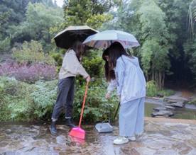 活动开始,志愿者们在涵虚楼前集合,进行分组,明确任务,随后根据各自负责的区域开始了工作。活动当中,每位同学各司其职,分工有序。志愿者们一边拿着扫把、簸箕、抹布等卫生工具各自清扫,一边举着雨伞遮挡风雨。一个多小时后,此次清扫工作圆满完成。