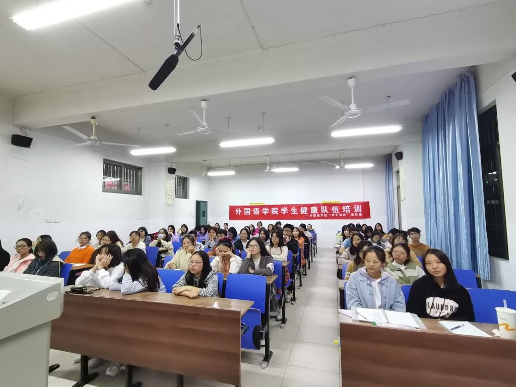 为了进一步提升学院心理健康教育工作队伍的责任意识、工作能力与工作实效,外国语学院“成长氧吧”辅导室于10月29日晚在涵虚楼C1303教室召开了新任心理部成员、心理委员及宿舍信息员培训工作会议。本期培训由外国语学院心理联络员、国家二级心理咨询师陈茂主讲。72名新任心理健康教育队伍成员参加了培训。