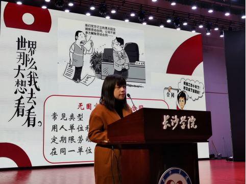 11月24日下午,由校关心下一代工作委员会举办,我院承办的“青年法治大讲堂”系列活动第二场在大礼堂举行。学校关工委常务副主任杨兴龙出席讲座,关工委秘书长张跃佳主持讲座,长沙市劳动人事仲裁院仲裁员、我院讲师佘艺颖与在场师生共同探讨了当今环境下“打工人”如何维护自身权益,600多名学生参加讲座。