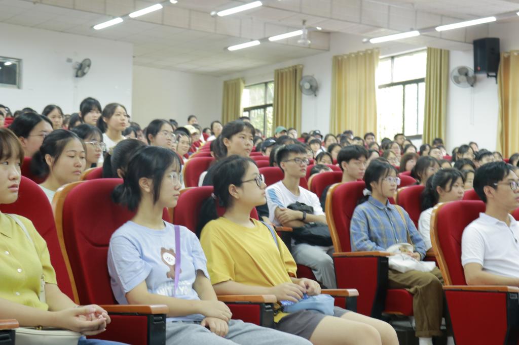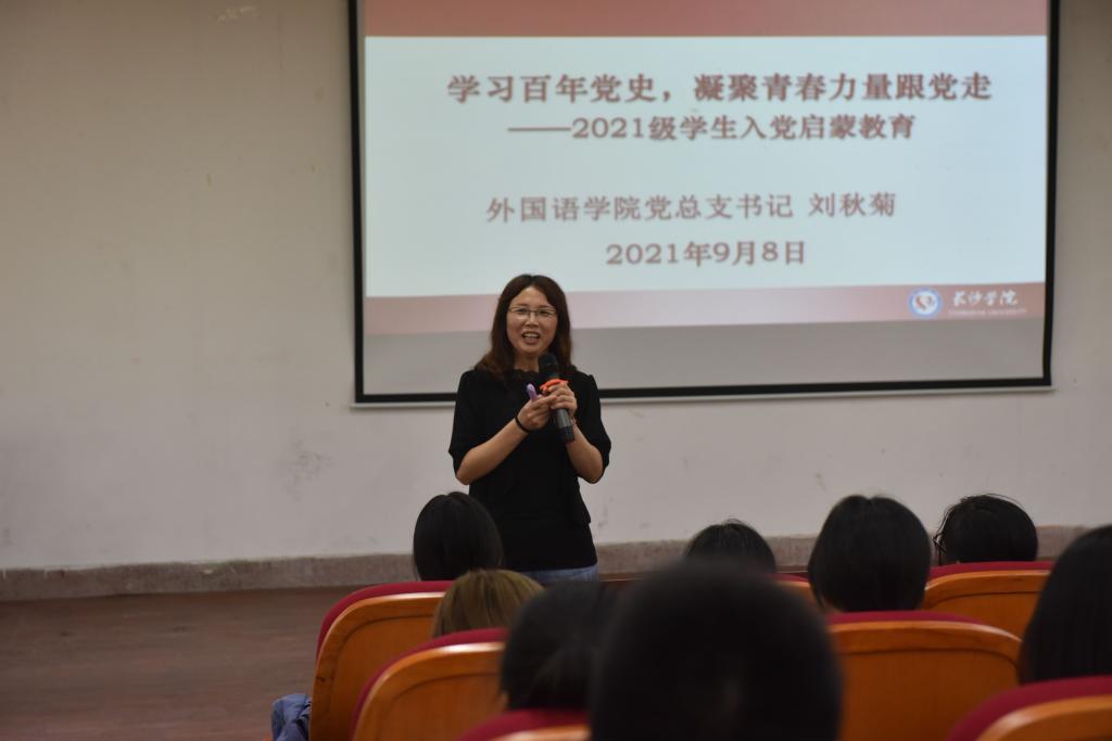 9月8日上午,外国语学院党总支书记刘秋菊在宁静楼T2为新生开展了入党启蒙教育,给新生上了一堂思政课。2021级全体新生和班导共300余人参加学习。