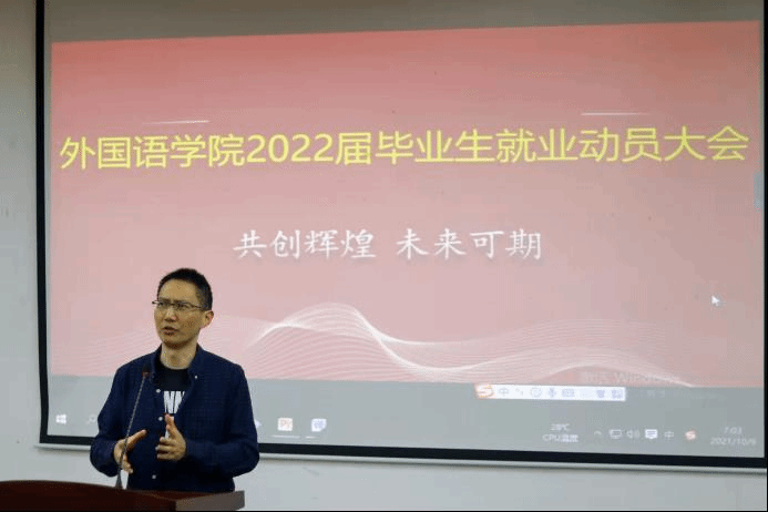 就业是每个毕业生走出象牙塔,迈向社会,实现从学生到祖国建设者的关键一步。为进一步做好2022届毕业生就业工作,2021年10月9日下午2点半外国语学院于宁静楼T2教室召开了2022届毕业生就业动员大会。外国语学院党总支书记刘秋菊、外国语学院副院长谢志辉、外国语学院党总支副书记姚金安以及18级全体学生参加了本次动员会。本次会议由外国语学院18级辅导员陈茂主持。 首先,由刘秋菊进行动员大会开场讲话。她分析了当前的就业形势,在全球疫情大背景的影响下,跨境电商冲击巨大,国外就业市场萎缩,国内就业竞争激烈,“双减”政策更是让教培行业步入“寒冬”。面临如此严峻挑战,她给同学们提出了三点建议:一是筑牢专业基础,二是增强就业信心,三是提高就业能力。最后刘秋菊强调了就业的意义。就业对当前国家的人才储备战略和民族复兴大计有着深远影响,对长沙市乃至湖南省的经济贡献巨大,也与外国语学院的后续发展息息相关。