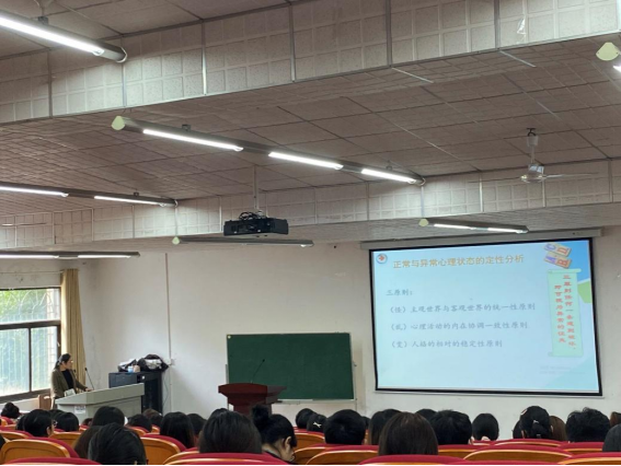 最后,陈老师介绍了大学生心理健康的标准,以正常与异常心理状态的定性分析为切入点,图文并茂的介绍了大学生常见的心理障碍,以“怪、乱、变”三个关键词为基础解释了判定心理异常的三原则。针对神经症、心境障碍、精神分裂症、人格障碍 、网络成瘾综合症这五种大学生常见的心理异常,陈老师引用了大量的案例,从症状表现、持续时间、社会功能情况、患者自知力等方面分析了存在的异常,引导参加培训的同学在互动中逐步掌握评判异常与正常的标准。