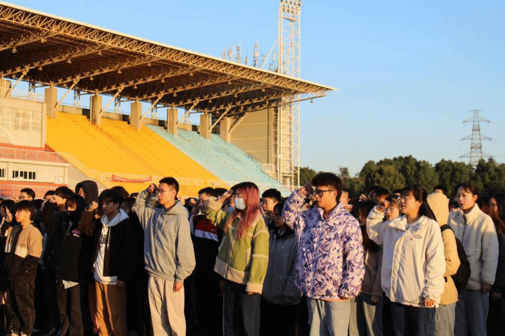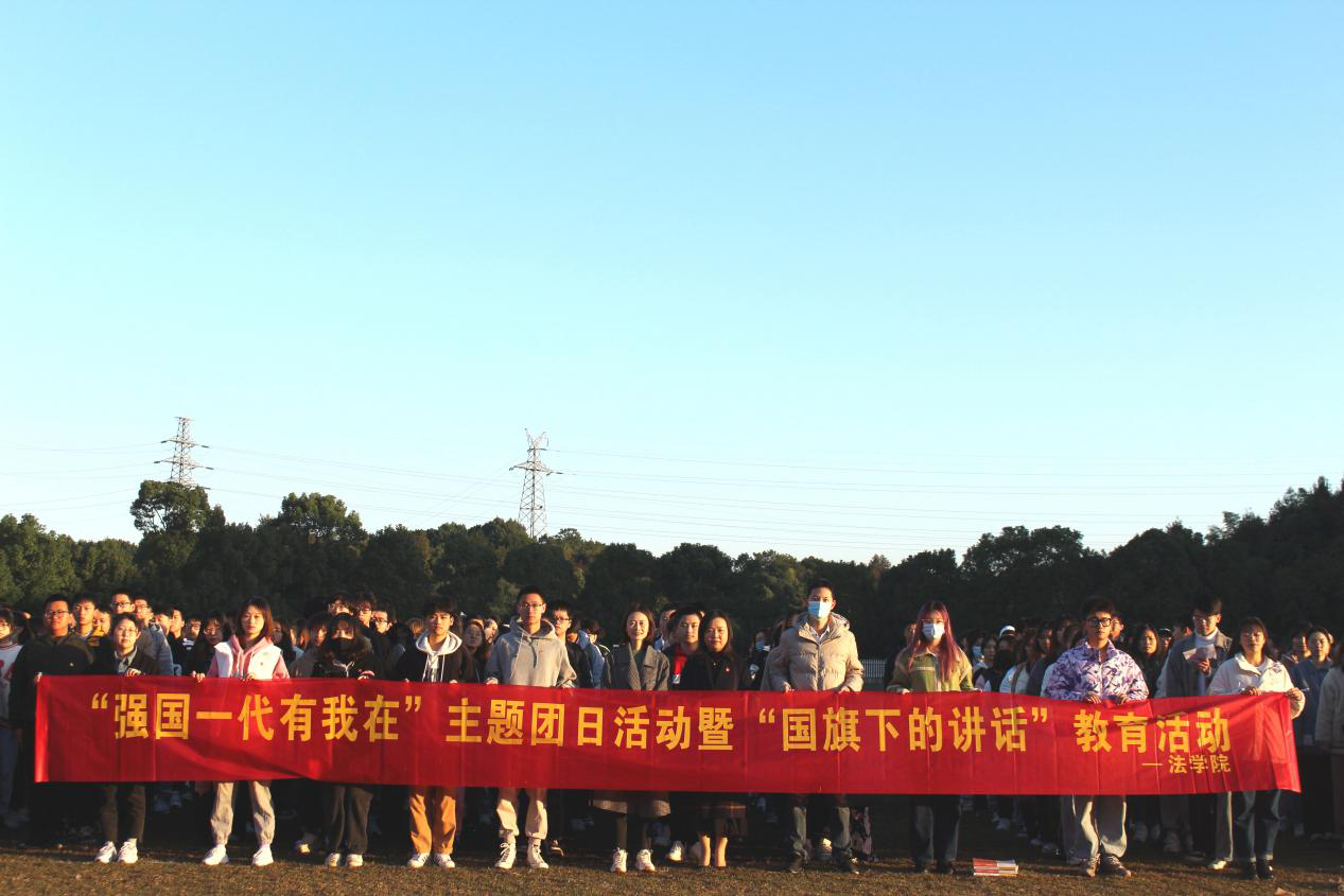 迎着晨曦,伴着秋风, 11月8日早上七点,我院于天健体育场举行了升旗仪式。参加本次升旗仪式的有法学院党总支书记胡卉明,团总支书记傅诗贻,辅导员张正东以及法学院19-21级全体同学。