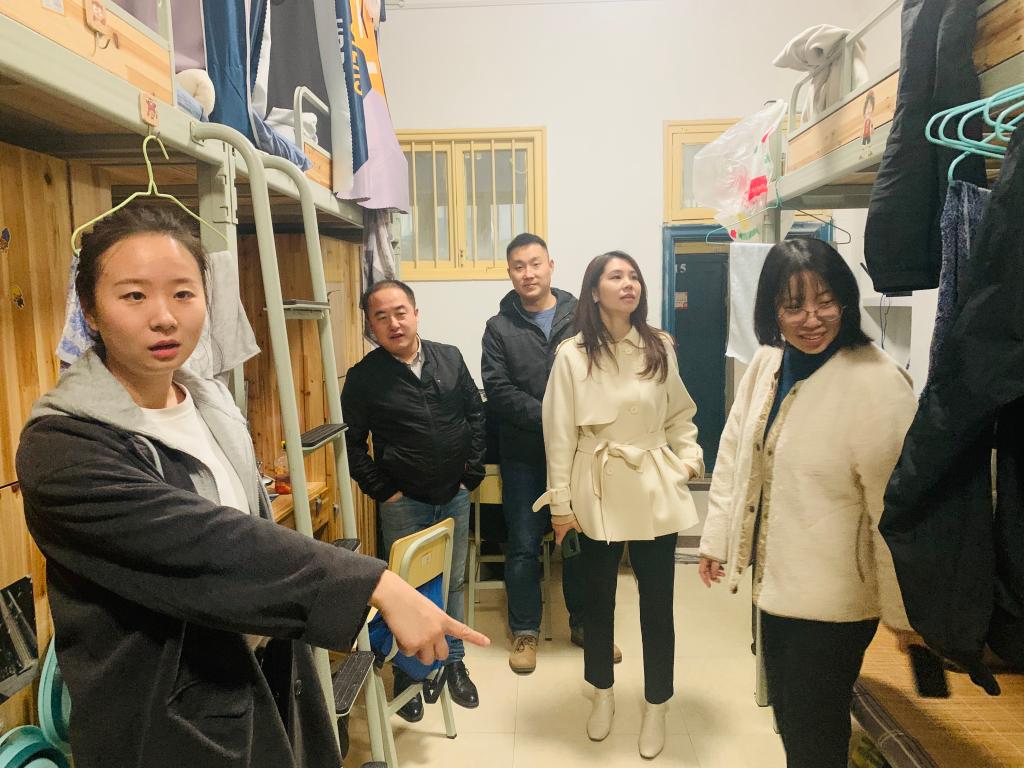 机电工程学院党总支书记张昊(左二)、副书记唐珍妮(左四)带领全体辅导员在21级新生宿舍开展安全检查工作