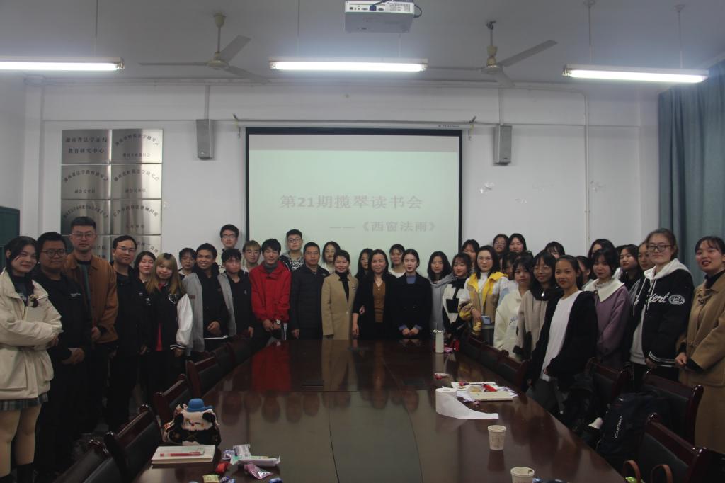 第21期揽翠读书会于11月11日晚上在涵虚楼A1404会议室顺利举办。参加本次读书会的有法学院党总支书记胡卉明、专职组织员夏湘远、党总支副书记廖生成、读书会发起人韩敬、中南大学硕士研究生王振宇、楚丰菱以及法学院各级学生。在发起人韩敬老师的带领下,大家共同品读《西窗法雨》一书。王振宇、楚丰菱、20级林文博、21级李嘉怡、汪志苏分别担任领读人。
