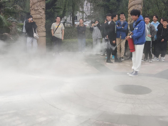讲座伊始,黄警官通过视频展现了生活中人们由于忽视消防安全而引发的各种事故,还结合身边的案例,配合一张张令人深思的图片讲述着忽视消防安全的所带来的严重后果。紧接着,黄教官给学生普及消防安全知识,准确地讲述了各种不同火情的应对方法。讲座的最后环节,黄警官组织了同学们进行一次消防疏散的演练,在同学们疏散到安全地点后,现场示范了灭火器的使用方法,讲述了几个关键步骤:一看二摇三拔四喷;并且让学生亲手体验怎样使用干粉灭火器。