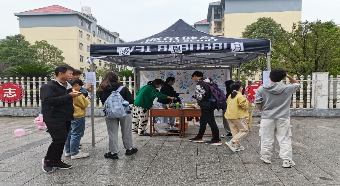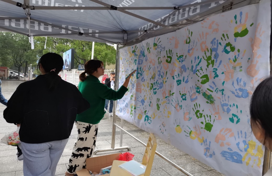 图一:“感恩墙”活动中正在印手印的同学