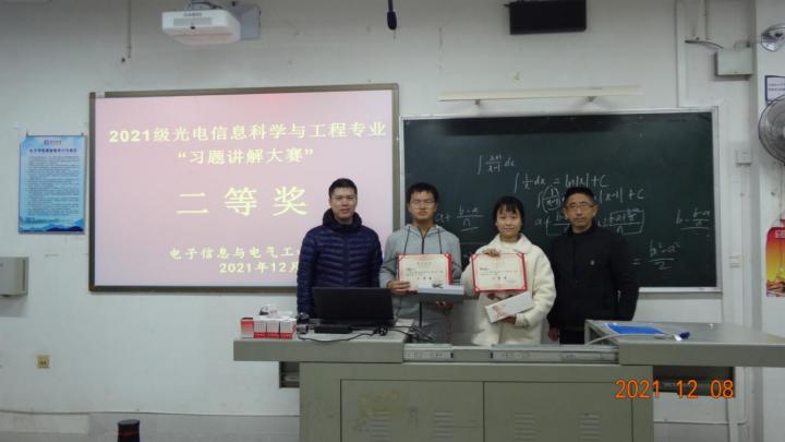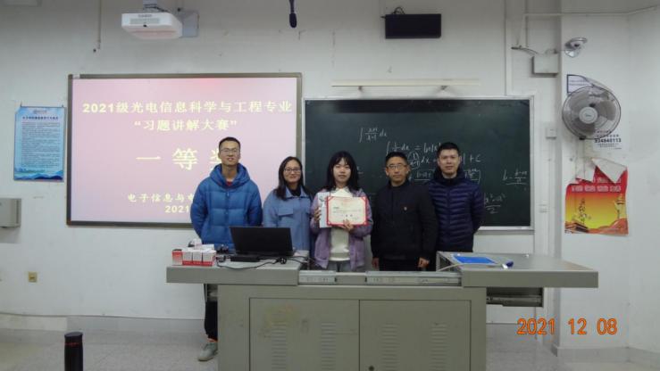 2021年12月1日和8日,2021级光电信息科学与工程专业两个班在涵虚楼首次开展了“习题讲解大赛”活动。经过激烈的角逐,两班共有16名同学分别获得一、二、三等奖和优秀奖。