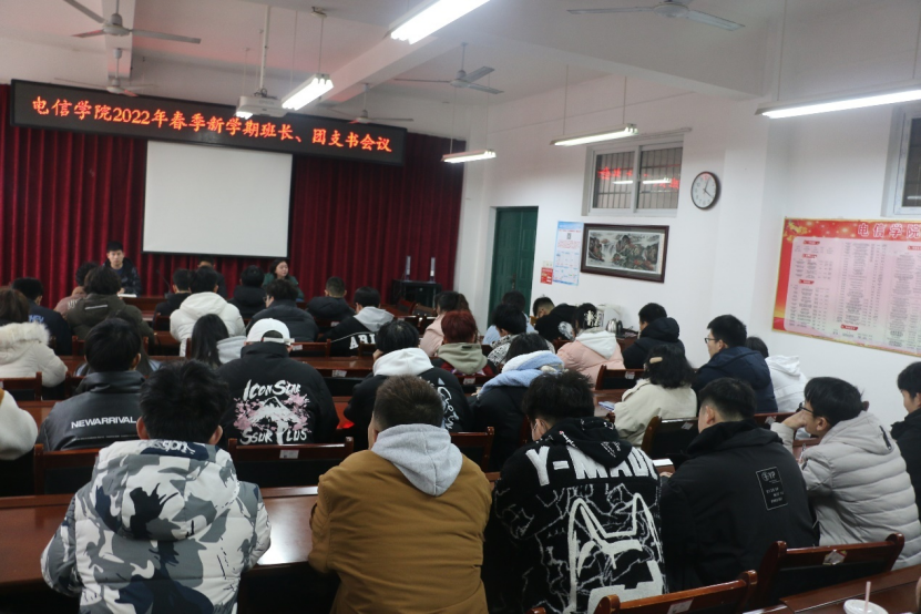 2月20日,电信学院在理工楼B202召开春季新学期学生干部工作会议,学院党总支书记张海涛、党总支副书记江艳、团总支书记聂云志、学院全体班长,团支书参加了本次会议。