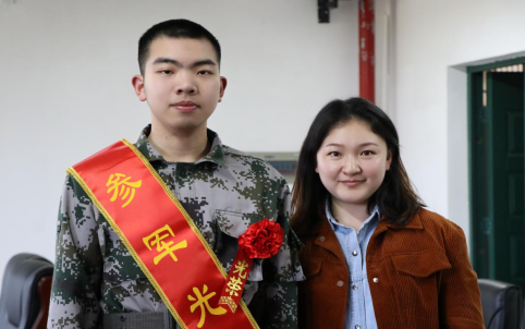 仪式后,辅导员苏婷老师为新兵李茗佩戴“参军光荣”的礼带与胸花,并合影留念。