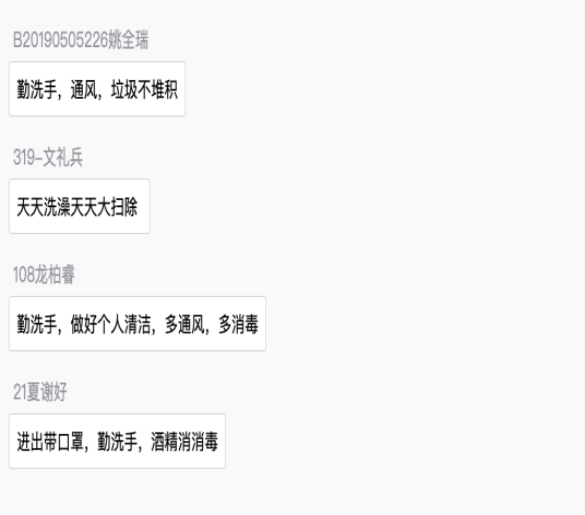 班会第三项:抗疫问答趣味多。班会在线上设置了“防疫知识有奖问答”环节,陈老师和王老师共设置了50个防疫小礼包,每个小礼包有30个医用外科口罩,为14个班级共送出1500个口罩。“防疫知识有奖问答”问题主要包括“因特殊情况出校需要办理哪些请假手续?”、“私自出校导致学校疫情防控出现问题的严重后果有哪些?”、“发现自己的健康码突然变黄(或红)后第一时间怎么处置?”、“如何在寝室做好个人防护?”等问题,同学们积极参与回答热烈,对于疫情防控期间的相关法律法规、防疫知识能做出准确回答。