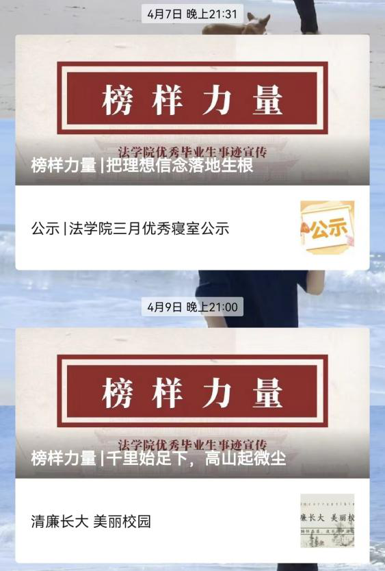 4月份是国家高校毕业生就业创业政策宣传月,也是离校前就业的一个高峰期。学院在就业政策解读、简历制作、远程面试等宣传推介的基础上,近期集中在公众微信号“法益人生”上连续推出了5期往届优秀毕业生事迹材料,宣传榜样事迹,学习榜样精神,以梦为马,不负韶华。