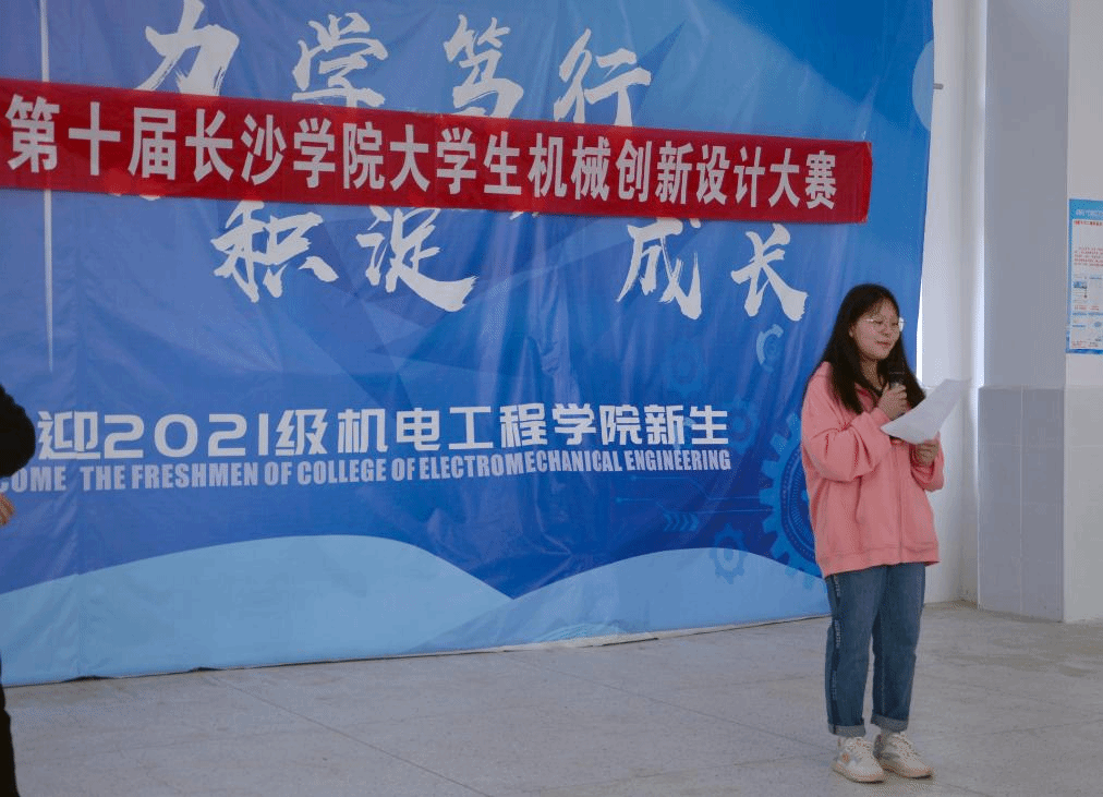开幕式由机电工程学院庞小兵副教授主持,大赛评委组组长唐勇教授介绍了评委成员及参赛作品的评价指标。随后,20机械02班张玉莹同学作为参赛学生代表进行赛前发言和宣誓,长沙学院教务处副处长谭义红为大赛致辞,最后,机电工程学院党总支书记张昊宣布大赛正式开始。