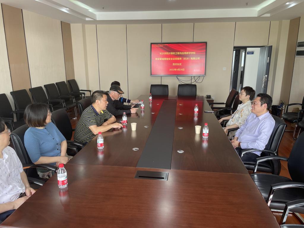 为深入推进就业“一把手工程”,在稳就业保就业促就业上出实招,长沙学院计算机工程与应用数学学院(以下简称计数学院)于4月28日上午9:30,在致远楼1612会议室与奇安星城网络安全运营服务(长沙)有限公司举行就业实习基地协议签约仪式,公司总经理王鑫、综合管理部总监范丽萍作为代表出席,计数学院院长李方敏、党总支书记曾一兵、副院长何文德、副院长赵碧海、党总支副书记廖良梅作为院方代表参加,校企双方代表举行会谈,双方就产学研合作交换意见,取得了丰硕的合作成果。