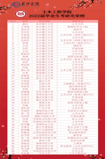 随着2022年全国硕士研究生录取工作接近尾声,土木学院考研捷报频传。今年我院102人参加硕士研究生考试,共有49名同学考取硕士研究生,考研录取率达到48.03%,有多名同学被武汉理工大学、南京理工大学、湖南师范大学、云南大学等国内重点高校录取。亮点纷呈,硕果累累!