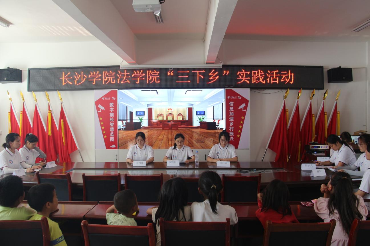 在普法过程中,团队成员分成三组,分别以“青少年保护”“反诈骗”“民法典”为主题进行“送法下乡”活动。成员们走近当地居民,在与当地居民的交流中,了解到当地的常见法律纠纷,并根据不同群体有针对性地为他们普及相关法律知识,也了解居民们在日常生活中存在的一些难以解决的纠纷矛盾并为他们提供相应咨询和建议。期间,团队成员开展了三次“情景剧--模拟法庭--普法宣讲”“三部曲”的普法宣传活动,并与湖南大学星心湘映支教团队协同在茨岩塘初级中学开展了普法宣传活动。