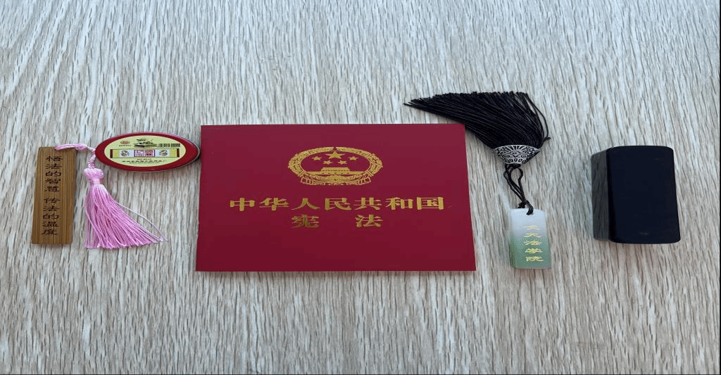 在报到点设置的礼物发放点前,新生络绎不绝,精选版的宪法读本、写有“悟法的智慧,传法的温度”精致书签、印有学院卡通形象的牛皮纸礼袋、系着各色流苏的定制姓名印章……学院为每名新生准备了一个体现专业特色的新生小礼包,与校徽等一同发给报到的新生。