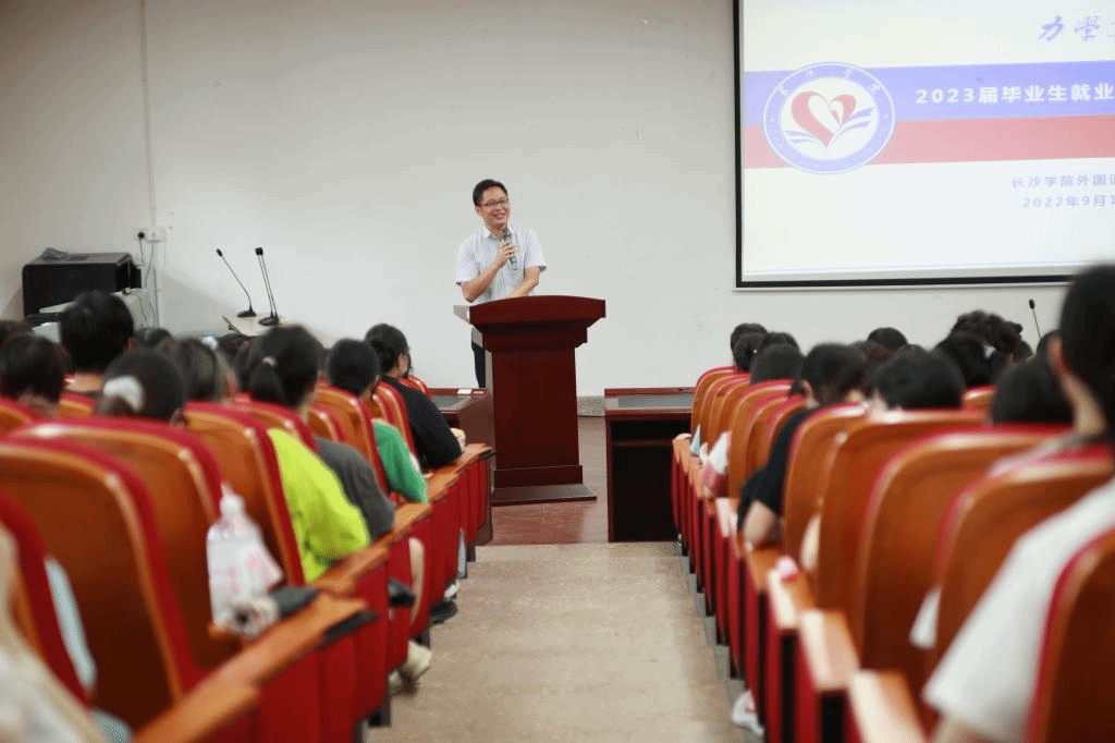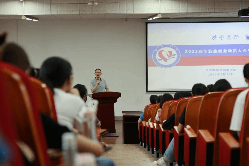 “日月不肯迟,四时相催迫。”为进一步做好2023届毕业生就业工作,外国语学院于2022年9月13日在宁静楼T2召开了了2023届毕业生就业动员大会。外国语学院院长刘芬、总支书记刘秋菊、副院长谢志辉、谢冬、副书记姚金安以及19级全体学生参加了动员大会。大会由就业专干陈茂主持。