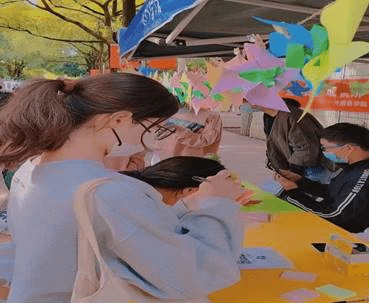 从十月十日七点半开始,精卫日活动在维智广场和洪山二食堂旁同时开展。外国语学院心理部成员提前为大家准备了象征着中国精神卫生标志的绿丝带和色彩斑斓的卡纸,后与摆点志愿者们一同在活动现场指导同学们如何用彩纸折风车,并向同学们示范如何将绿丝带贴于风车中央且用夹子固定到挂绳处。暖风拂过,同学们的脸上洋溢着幸福的笑容,象征着健康和爱心的绿丝带与五彩风车一起随风舞动,这些风车携带着同学们的热情与激情,为长大校园又增添了一抹不同的色彩。